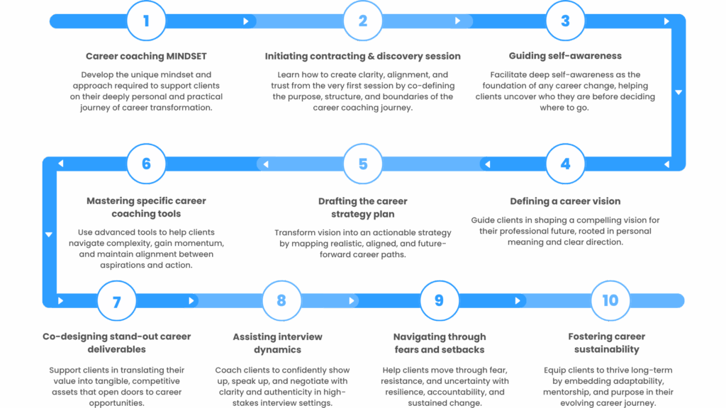 The Career Coaching Certification is designed for professionals who want to make a meaningful impact by guiding individuals through career transitions, growth, and decision‑making.